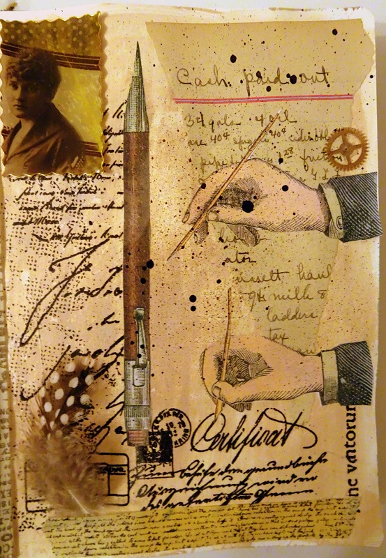 I am sharing another double-page from my journal using paper-scraps from my table, some pieces of a vintage ledger and some collage images from Tumblefish Studios. The background was gessoed and then darkened with my home-made, vintage brown ink, which I also splattered with a quill pen over the finished collage, as well as adding some random stamping: