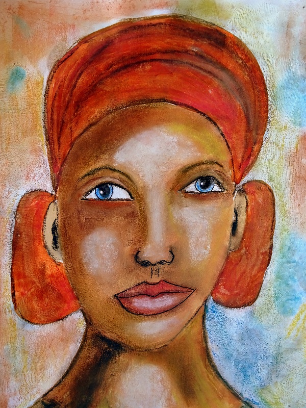 I have a piece inspired again by Melanie River. I was trying to paint a strong looking sort of medicine woman, and perhaps she looks a bit too  strong! I painted her on an A3 textured background using acrylics and pastels. I am also linking to Tracey's theme at AJJ: