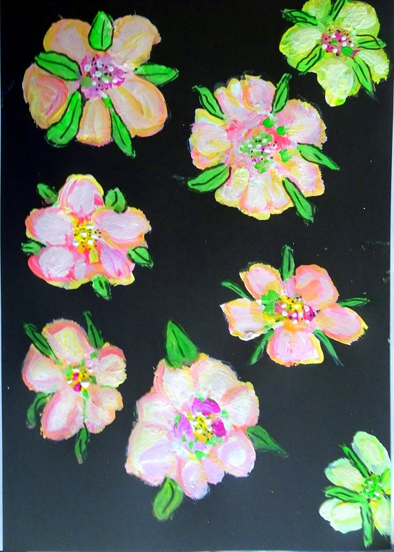 Your page is beautiful. I have never seen black watercolour paper, I did not even know such a thing existed but what lovely flowers you have painted on it. Especially the close ups where we see the texture you have got. They really are lovely flowers and contrast so beautifully with the silkiness of what the lady is wearing.